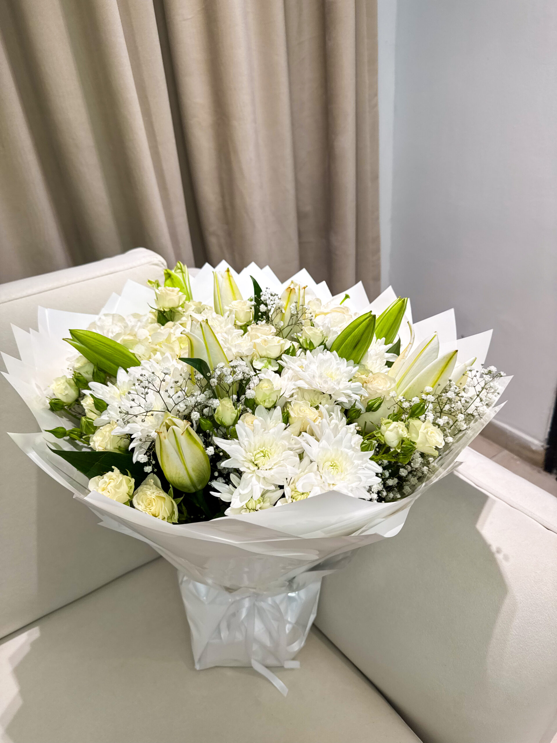 A beautiful mix of lilies, mums, spray roses and gypsophilia